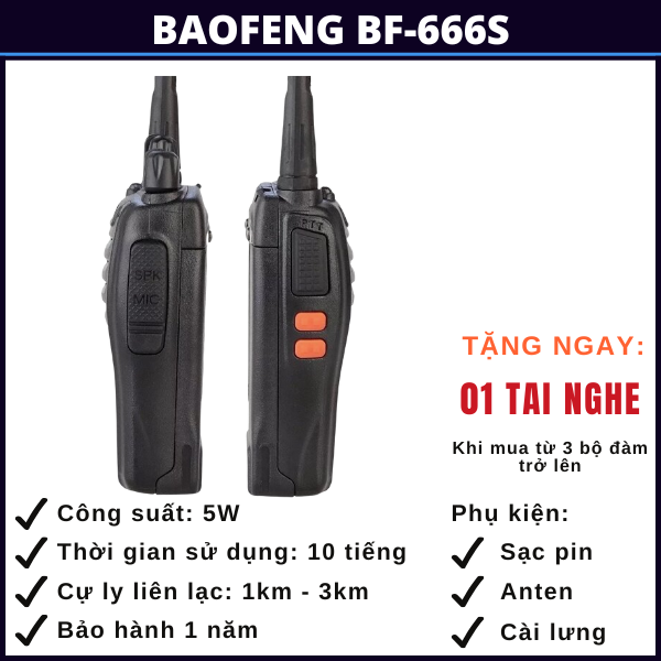 Bộ đàm Baofeng BF 666S là dòng máy bộ đàm dùng để liên lạc 2 chiều với rất nhiều tính năng ưu việt cùng cự ly liên lạc nhóm tới 3km là sự lựa chọn phù hợp cho các tổ chức, cá nhân thường xuyên làm việc trong phạm vi dưới 3km hoặc các tòa nhà cao tầng như các công trình xây dựng, villa nhỏ và vừa, nhà máy, xưởng sản xuất, cửa hàng buôn bán, siêu thị mini, an ninh, bảo vệ, quán karaoke, quán nhậu, quán cafe,…