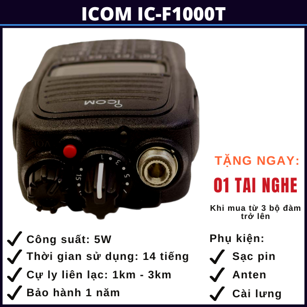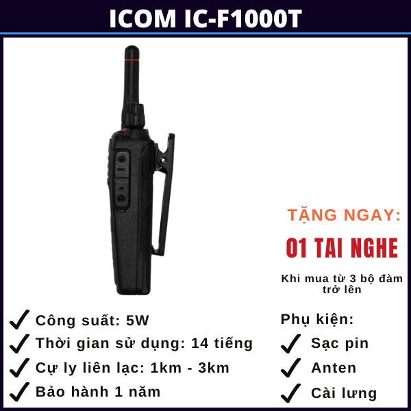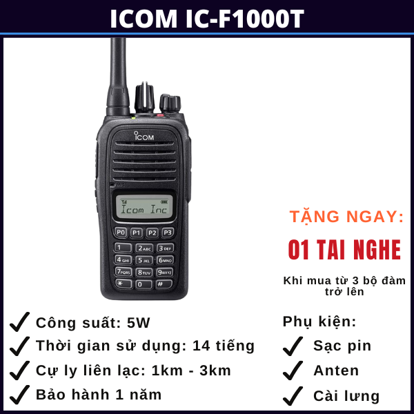 Bộ đàm Icom IC-F1000T là thiết bị liên lạc 2 chiều sử dụng tần số VHF với nhiều ưu điểm nổi bật so với các dòng bộ đàm khác như tính năng tính năng mã hóa giọng nói, tính năng đàm thoại rảnh tay (VOX) hay tính năng giới hạn thời gian phát (TOT). Người sử dụng dễ dàng làm việc theo nhóm bằng cách kết nối với các máy bộ đàm có cùng tần số và kênh liên lạc. Người nói chỉ cần bấm và giữ nút PTT để truyền thông tin đến người nghe và bỏ nút PTT khi muốn nghe thông tin từ người đang đàm thoại với mình.