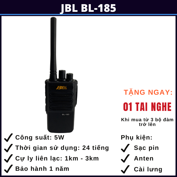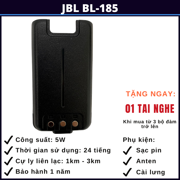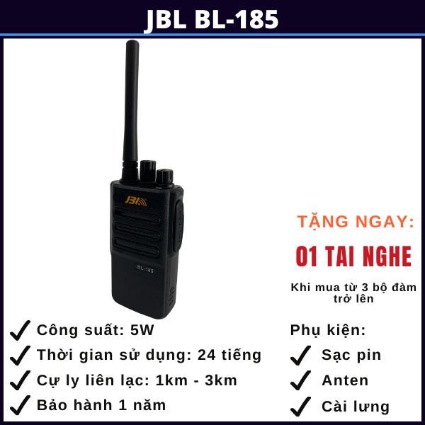 Bộ đàm JBL BL-185 là thiết bị liên lạc 2 chiều sử dụng tần số UHF được sản xuất chính hãng bởi JBL với nhiều ưu điểm nổi bật so với các dòng bộ đàm khác như tính năng tự dò tần số, thời gian sử dụng dài, thiết kế nhỏ gọn và chắc chắn giúp người sử dụng dễ dàng làm việc theo nhóm bằng cách kết nối với các máy bộ đàm có cùng tần số và kênh liên lạc. Người nói chỉ cần bấm và giữ nút PTT để truyền thông tin đến người nghe và bỏ nút PTT khi muốn nghe thông tin từ người đang đàm thoại với mình.