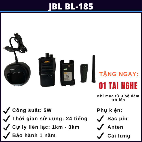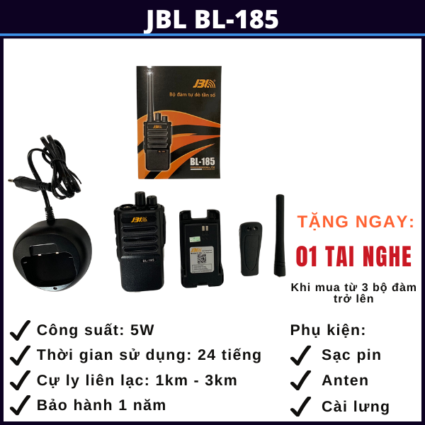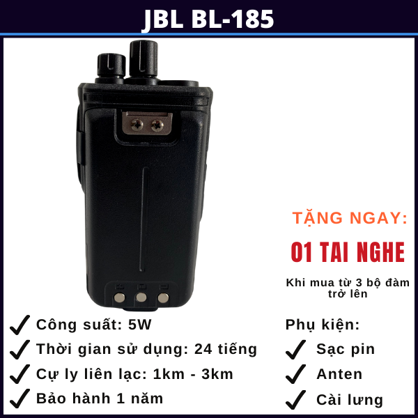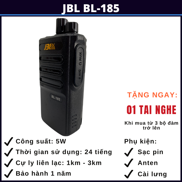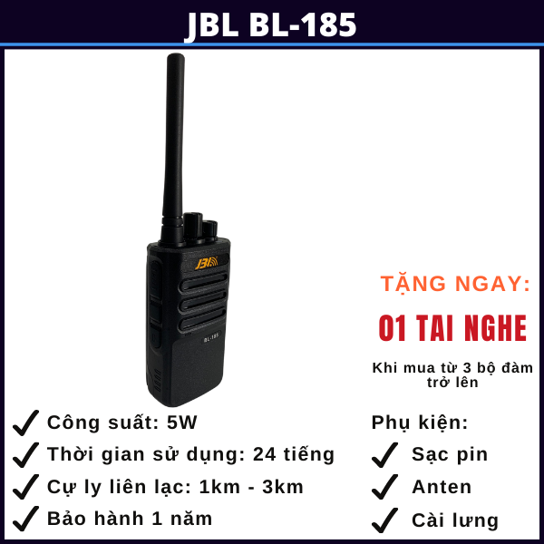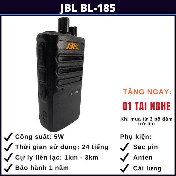 Bộ đàm JBL BL-185 là dòng bộ đàm cầm tay dùng để liên lạc 2 chiều với rất nhiều tính năng ưu việt như hiệu năng Pin cao cùng khả năng tự dò tần số là sự lựa chọn phù hợp cho các tổ chức, cá nhân có số lượng máy bộ đàm lớn và sử dụng các dải tần số khác nhau để làm việc theo từng nhóm như các xưởng sản xuất trong phạm vi rộng, cảng biển, logistics, tàu biển hay bộ đội, kiểm lâm,…