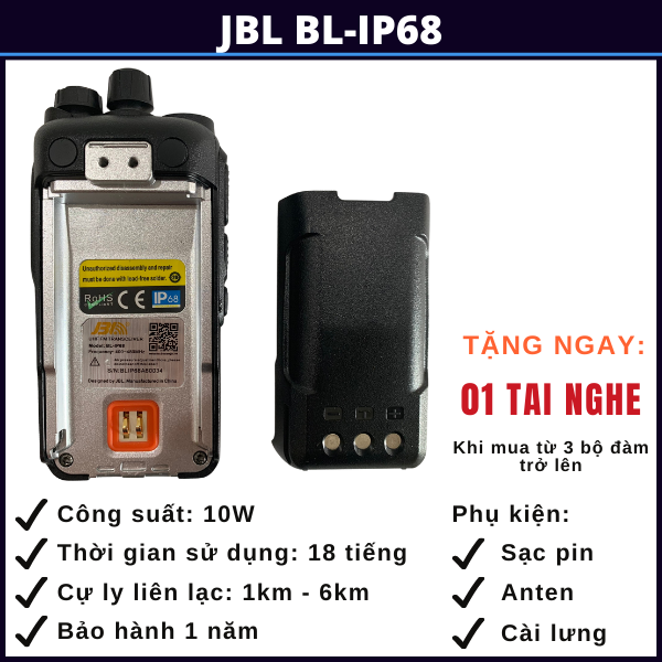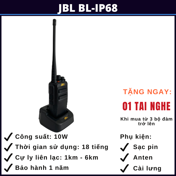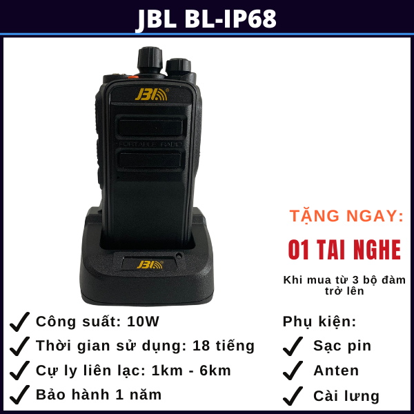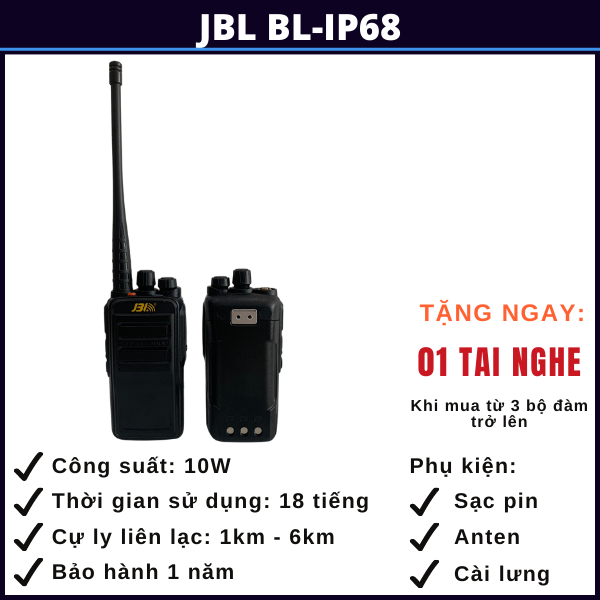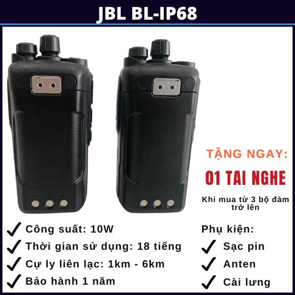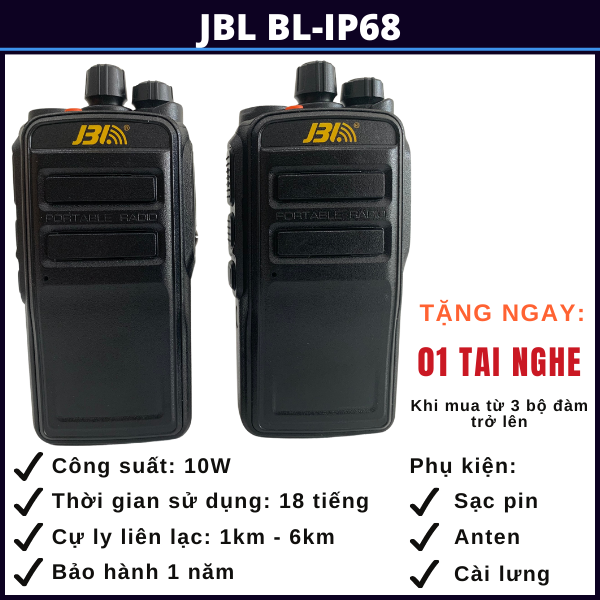 Bộ đàm JBL IP-68 là thiết bị liên lạc 2 chiều sử dụng tần số UHF được sản xuất chính hãng bởi JBL với nhiều ưu điểm nổi bật so với các dòng bộ đàm khác như khả năng chống nước vượt trội, thời gian làm việc dài cùng cự ly liên lạc tới 5km giúp người sử dụng dễ dàng làm việc theo nhóm bằng cách kết nối với các máy bộ đàm có cùng tần số và kênh liên lạc. Người nói chỉ cần bấm và giữ nút PTT để truyền thông tin đến người nghe và bỏ nút PTT khi muốn nghe thông tin từ người đang đàm thoại với mình.
